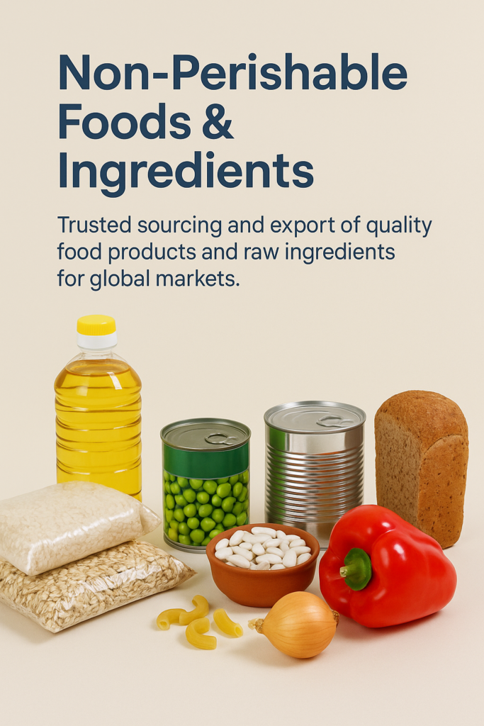 Our Non Perishable Foods and Ingredients division specializes in the trusted sourcing and export of high quality food products and raw ingredients for global markets. We work with established producers and certified suppliers to ensure consistent quality, safety, and compliance with international food standards. Our product range supports food manufacturers, distributors, and retailers with reliable supply continuity and competitive pricing. From procurement and quality inspection to packaging and export logistics, every stage is carefully managed for efficiency and accuracy. Our commitment to reliability, traceability, and responsive service ensures long term value for our global food industry partners.